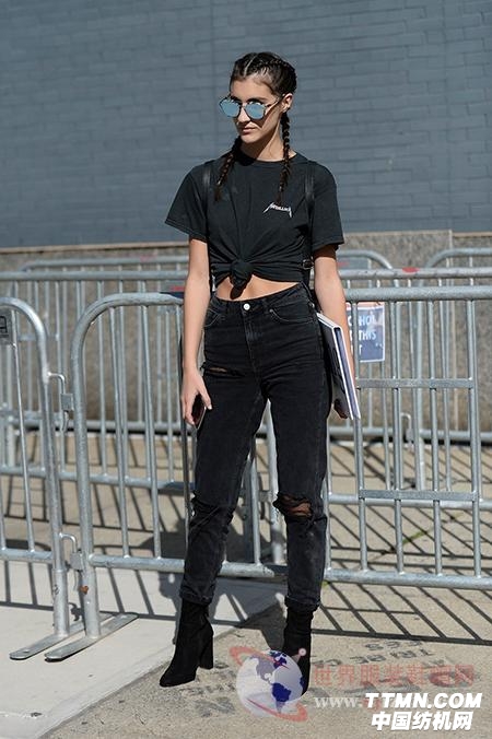 黑色T恤搭配破洞牛仔褲,時尚又不失活潑,盡顯好身材。