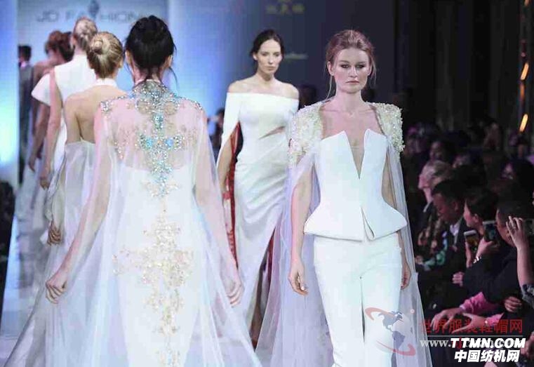 斗篷款婚紗在折紙效果的短上衣與九分褲成衣概念基礎(chǔ)上,突出肩部的重工設(shè)計(jì),以金色與白色的立體珠繡打造廓形感十足的肩部線(xiàn)條,并增加透明圓形拖擺,雪花的刺繡裝飾如同冰雪女王的重生般輕盈靈動(dòng)。兜帽款婚紗帶有濃郁中世紀(jì)復(fù)古風(fēng)格,在抹胸連體褲的基礎(chǔ)上外罩透明薄紗兜帽斗篷,以蕾絲、羽毛等材料打造似羽毛、似藤蔓的手工藝刺繡圖案,如同穿梭林間的精靈,帶著一絲神秘與夢(mèng)幻,行走在生機(jī)盎然的奇幻世界。黑色羽毛裝飾婚紗帶著女王般的霸氣,壓軸展現(xiàn)在人們眼前。超高不規(guī)則立領(lǐng)設(shè)計(jì),以黑紗半遮面,營(yíng)造神秘高貴的氣質(zhì)。挺括的小A字裙后的大羽毛拖尾,霸氣十足,又不是雍容之感。薄紗的巧妙使用是該款婚紗中的設(shè)計(jì)亮點(diǎn),胸口部分形成不規(guī)則鏤空設(shè)計(jì),與腿部的打底裝飾,讓這套婚紗在硬朗與性感之間實(shí)現(xiàn)了自由切換。