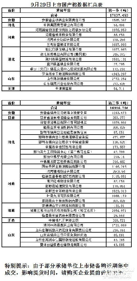 9月29日兩節共計輪出儲備棉34054.157噸。第一節銷售儲備棉17137.453噸,其中國產棉17137.453噸、進口棉0噸。第二節銷售儲備棉16916.704噸,其中國產棉16916.704噸、進口棉0噸。