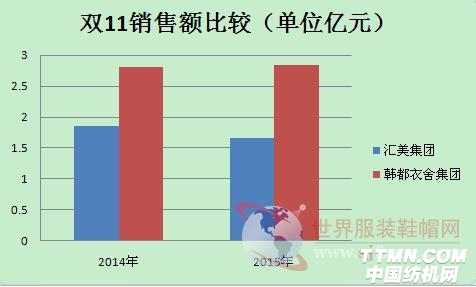 2015年雙11,韓都衣舍電商集團以2.84億元的交易額,奪得互聯網服飾品牌冠軍,韓都衣舍子品牌群銷售占比由去年的28%,上升接近40%。2014年,雙11當天韓都衣舍集團總銷售額達到2.8億元,韓都衣舍旗艦店銷售額超過1.99億元。