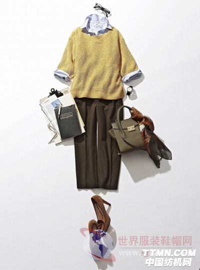 內搭襯衫多層次穿法展現正式感,搭配長褲,穿出成熟的職場造型,七分袖芥末黃毛衣帶出秋天的亮點。
