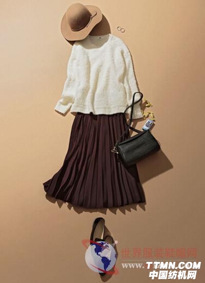 白色毛呢毛衣搭配酒紅色細摺中長裙,既優雅又可愛,最適合約會展現甜美時尚,搭配棕色、黑色配件,可愛再加上知性。