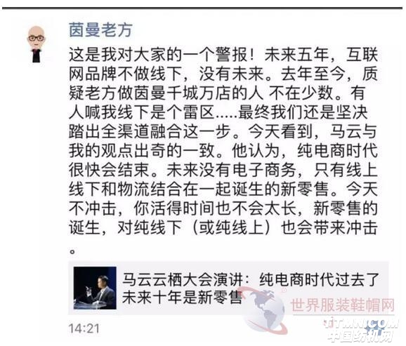 去年至今,質疑老方做茵曼千城萬店的人不在少數,也有人喊我線下是個雷區…最終我們還是堅決踏出全渠道融合這一步。今天看到,馬云與我的觀點出奇的一致。