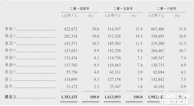 圖為集團各區域的業績收入對比數據