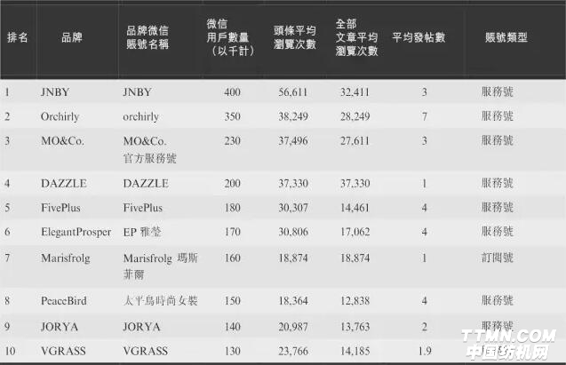 圖為中國十大女裝微信公眾號影響力排行榜