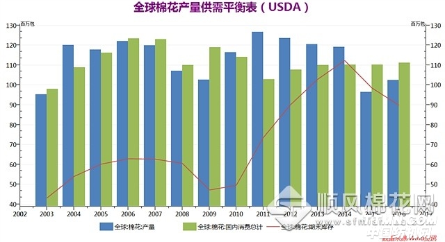 自2014年以來(lái),全球市場(chǎng)棉花庫(kù)存連續(xù)第三年降低。根據(jù)美國(guó)農(nóng)業(yè)部(USDA)的統(tǒng)計(jì)數(shù)據(jù)顯示,2016/17年度全球棉花產(chǎn)量增加,庫(kù)存小幅調(diào)整。其中印度棉產(chǎn)量下調(diào)10.9萬(wàn)噸至577萬(wàn)噸,美棉產(chǎn)量上調(diào)至351.5萬(wàn)噸,澳大利亞棉產(chǎn)量上調(diào)15.2萬(wàn)噸至76.2萬(wàn)噸,全球棉產(chǎn)量上調(diào)19.3萬(wàn)噸至2231萬(wàn)噸。而全球用棉量下調(diào)0.7萬(wàn)噸至2421.8萬(wàn)噸,庫(kù)存上調(diào)4.3萬(wàn)噸至1955.4萬(wàn)噸。
