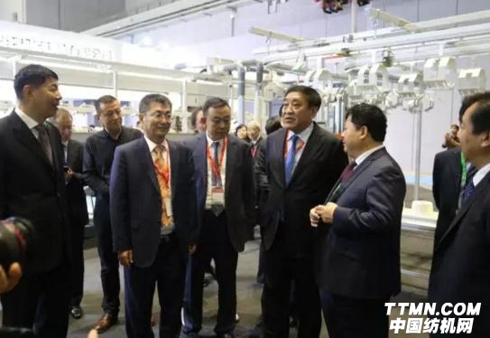 (中國紡機集團總經理葉茂新等陪同中國紡織工業聯合會黨委書記王天凱參觀中國紡機集團展位)