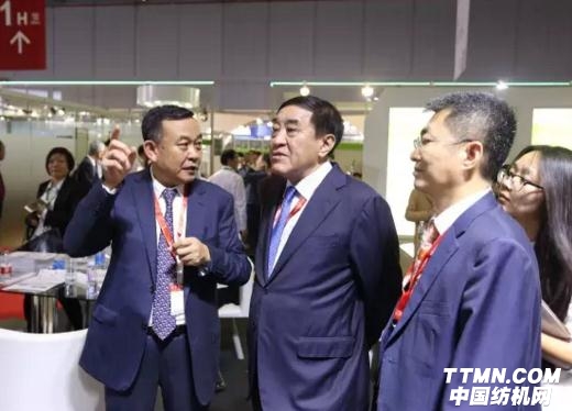 (中國紡機集團總經(jīng)理葉茂新、中國紡織工業(yè)聯(lián)合會黨委書記王天凱參觀網(wǎng)上紡機展展臺,并聽取講解)