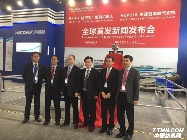 在2016年10月21日上海紡機展開幕的第一天,青島環球集團股份有限公司隆重召開“全球首發新聞發布會”,推出了HR-01紡織工廠智能機器人和HCP910高速智能噴氣織機兩款產品。