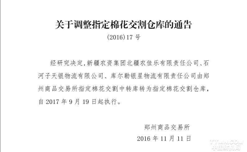關(guān)于調(diào)整指定棉花交割倉庫的通告