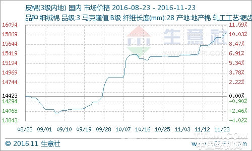 根據生意社價格監測顯示,11月23日,國內棉花價格呈現上漲態勢,目前3128B級皮棉價格在15805-16000元/噸,較月初上漲3.63%。當日鄭棉1701合約收漲,截止11月23日收盤報16090元/噸,較11月1日結算價15250元/噸上漲5.51%。11月22日,市場靜待12月合約的第一個通知日,觀望較濃,ICE3月期棉合約收跌0.05美分或0.07%,報每磅72.24美分。