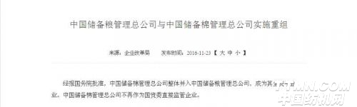 國資委公告,經(jīng)報國務院批準,中國儲備棉管理總公司整體并入中國儲備糧管理總公司,成為其全資子企業(yè)。中國儲備棉管理總公司不再作為國資委直接監(jiān)管企業(yè)。