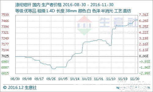 據生意社價格監測顯示,11月滌綸短纖市場價格呈先跌后漲態勢,截止11月30日,1.4D*38mm的滌綸短纖市場均報價在7478元/噸,較月初價格上漲了3.35%,同比上漲10.42%。