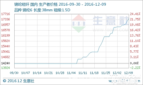 據生意社價格監測顯示,截止到12月9日,國內錦綸短纖1.5D主流價格報至17400元/噸,較周初上調2.72%,同比上漲8.61%。