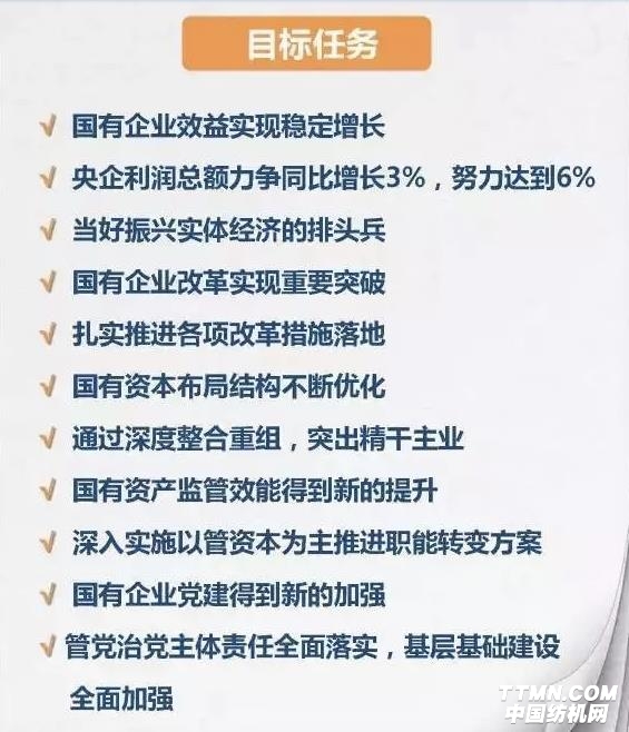 12日至13日的中央企業、地方國資委負責人會議強調,2017年國企國資改革發展的主要目標任務是:國有企業效益實現穩定增長。中央企業利潤總額力爭同比增長3%、努力達到6%。當好振興實體經濟的排頭兵,國有資本保值增值水平穩中有升,資產負債率繼續下降,盈利能力不斷增強,實現有質量、有效益、可持續的發展。國有企業改革實現重要突破。以提高企業核心競爭力和資源配置效率為目標,扎實推進各項改革措施落地,不斷激發企業活力。國有資本布局結構不斷優化。通過深度整合重組,突出精干主業,持續優化國有資本配置,提升國有資本運行效率,放大國有資本功能。國有資產監管效能得到新的提升。深入實施以管資本為主推進職能轉變方案,努力使監管職能定位更加準確,監管制度體系更加完善,監管方式更加科學,監管措施更加有效。