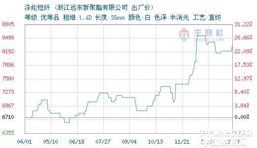 02月03日浙江遠東新聚酯有限公司關于滌綸短纖的報價為8310元/噸。滌綸短纖的出產地為浙江紹興;滌綸短纖的屬性:等級:優等品;粗細:1.4D;長度:38mm;顏色:白;色澤:半消光;工藝:直紡。該報價有效期為7天。