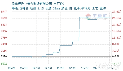 02月03日安興彩纖有限公司關于滌綸短纖的報價為8700元/噸。滌綸短纖的出產地為安徽滁州;滌綸短纖的屬性:等級:優等品;粗細:1.4D;長度:38mm;顏色:白;色澤:半消光;工藝:直紡。該報價有效期為7天。
