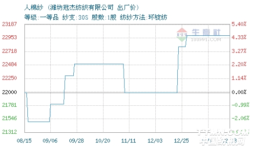 02月03日濰坊冠杰紡織有限公司關于人棉紗的報價為23000元/噸。人棉紗的出產地為江蘇;倉儲地為江蘇省;人棉紗的屬性:等級:一等品;紗支:30S;股數:1股;紡紗方法:環錠紡。該報價有效期為3天。
