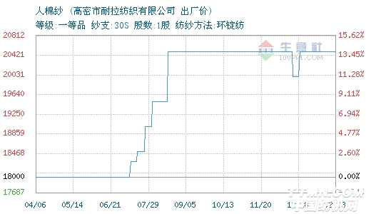 02月03日高密市耐拉紡織有限公司關于人棉紗的報價為20500元/噸。人棉紗的出產地為山東;倉儲地為山東??;人棉紗的屬性:等級:一等品;紗支:30S;股數:1股;紡紗方法:環錠紡。該報價有效期為7天。