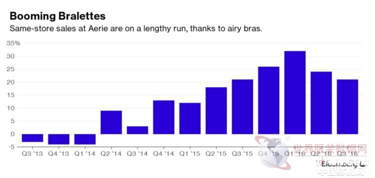 A&F大概是跟競爭對手American Eagle Outfitters學了這一招。自從AEO旗下的內衣品牌Aerie著力銷售Bralette以來,其同店銷售已經經歷了連續8個季度的兩位數增長。