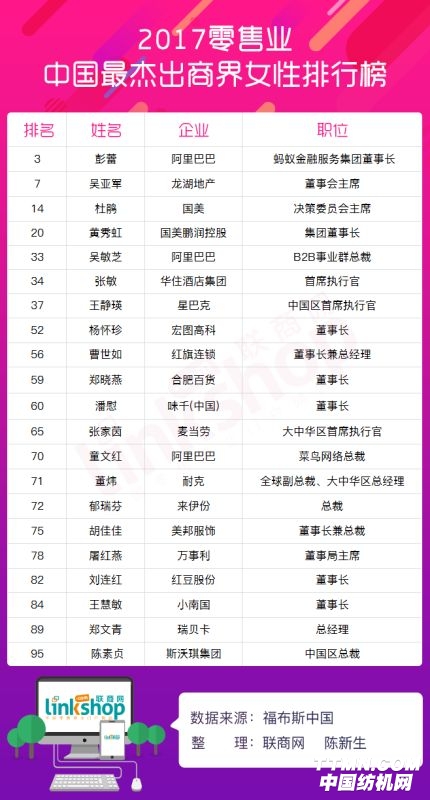媒體經過查詢發現,共有21位涉足零售行業的內地商界女性入選,其中阿里巴巴共有3位女性入選,分別螞蟻金服董事長彭蕾、B2B事業群總裁吳敏芝和菜鳥網絡總裁童文紅。國美有2位女性入選,分別是國美決策委員會主席杜鵑和鵬潤控股集團董事長黃秀虹。
