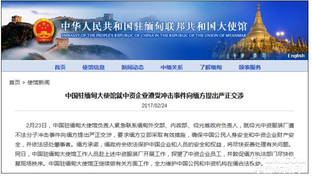 據中國駐緬甸大使館官網消息,2月23日,中國駐緬甸大使館負責人緊急聯系緬甸外交部、內政部、仰光省政府負責人,就仰光中資服裝廠遭不法分子沖擊事件向緬方提出嚴正交涉,要求緬方立即采取有效措施,確保中國公民人身安全和中資企業財產安全,并依法懲處肇事者。