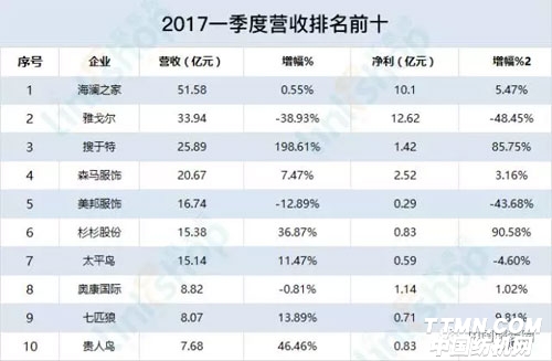 休閑裝穩中求進運動戶外庫存壓力仍重在記者統計的排名前十的服裝企業中,休閑裝領域占得過半的份額,達6家。其中不乏期內剛上市的的太平鳥,一季度實現營收同比增長11.47%,為15.14億元。因受到訂貨模式切換影響,森馬在期內增長沒有達到雙位數,但還是實現了營收與凈利雙升。
