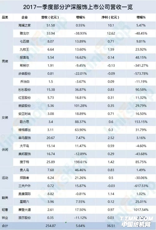 滬深服裝上市企業2017年第一季度報告披露已結束,《聯商網》統計監測了具有代表性的25家服飾企業。截至3月31日,這25家企業總營收254.87億元,同比增長5.64%;凈利潤為36.51億元,同比降低19.82%。
