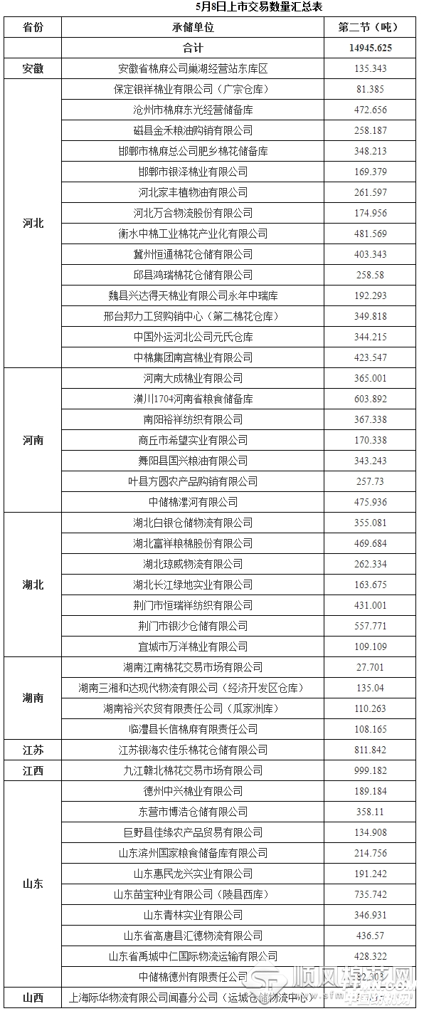 中國儲(chǔ)備棉管理總公司定于5月8日第二節(jié)上市交易儲(chǔ)備棉重量14945.625噸,其中需要倒垛出庫77捆,相關(guān)明細(xì)見附件。 具體庫點(diǎn)及數(shù)量如下: