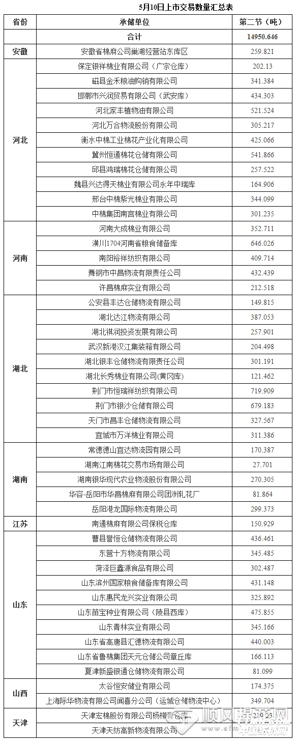 中國儲備棉管理總公司定于5月10日第二節上市交易儲備棉重量14950.646噸,其中需要倒垛出庫83捆,相關明細見附件。 具體庫點及數量如下:
