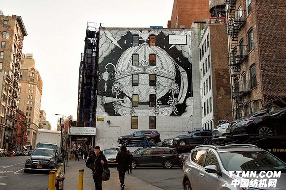 而就在幾個與前,Gucci已經做過類似的壁畫項目。2017年2月,它就宣布本年將和戶外手繪廣告公司Colossal Media合作,在紐約市Soho區的Lafayette街展出面積為2500平方英尺的大型壁畫,而負責繪畫的藝術家是舊金山插畫家Jayde Fish,整個創作歷時6天完成。
