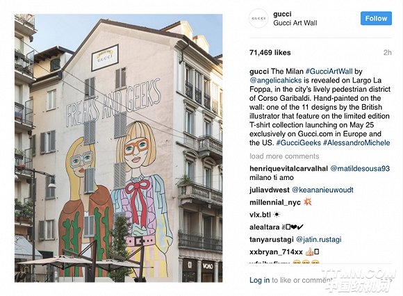 壁畫中,在“怪胎和極客”的標語下,是兩位帶著眼鏡的時髦女孩。不遠處則是Gucci的品牌標志,表明了這個藝術作品并不是街頭藝術家的隨性之作,而是名花有主的官方行為。