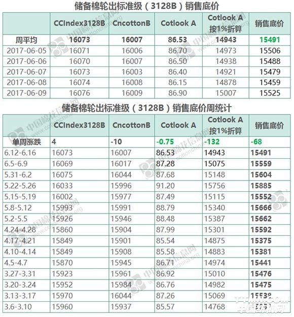 根據《關于國家儲備棉輪換有關安排的公告》(2016年第9號)內對儲備棉輪出銷售底價計算公式計算,2016/2017年度儲備棉輪出(6月12日-6月16日一周)輪出銷售底價為