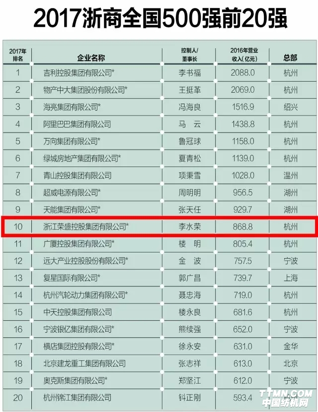 6月8日,第14屆浙商大會在杭州召開,“2017浙商全國500強”榜單也隨之公布。榮盛控股集團以營業收入868.8億元躋身榜單前10名,值得注意的是,這也是前10名中唯一一家化纖企業。