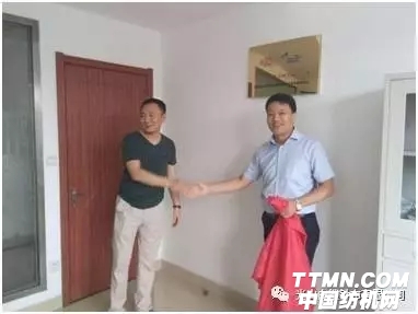 圖:揚州怡人紡織有限公司總經理侯令(左一)與光山白鯊針布有限公司銷售總經理王先利(右一)共同為分梳技術研究站揭牌