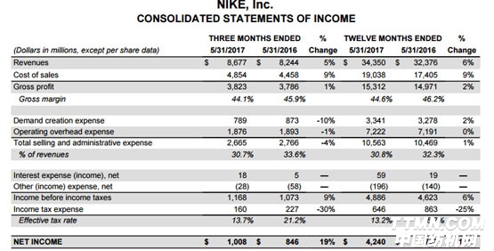 29日晚,耐克發布了截至2017年5月31日的2017財年第四季度及全年財務報告。第四季度中,耐克公司實現營業收入87億美金,同比增長5%;凈利潤10.08億,同比增長19%;毛利率為44.1%,比去年同期下降了1.8%。