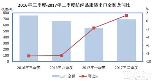 2016年四季度對(duì)歐盟出口遭遇低點(diǎn),降幅超過一成,今年以來逐步回升,一、二季度降幅逐步縮小為3.2%和0.3%。上半年對(duì)歐盟累計(jì)出口222.5億美元,下降1.6%,其中紡織品增長2.3%,服裝下降3%。大類商品針?biāo)罂椃b合計(jì)出口量增長1.2%,出口平均單價(jià)下跌4.6%。