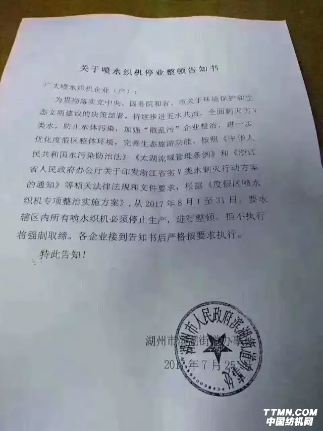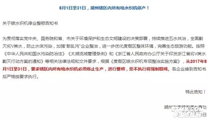 據江蘇、浙江一帶紡企介紹,7月以來,環保部督查嚴格,存在污染問題的企業被關停,大中型企業也不例外被嚴加整改,增加環保除塵設施,這對污染較重的化纖企業和排塵較大的粘膠企業而言,不只成本上升,被關停者不在少數。近日,湖州市下發通知,自8月1日起,湖州所有噴水織機都將停產!