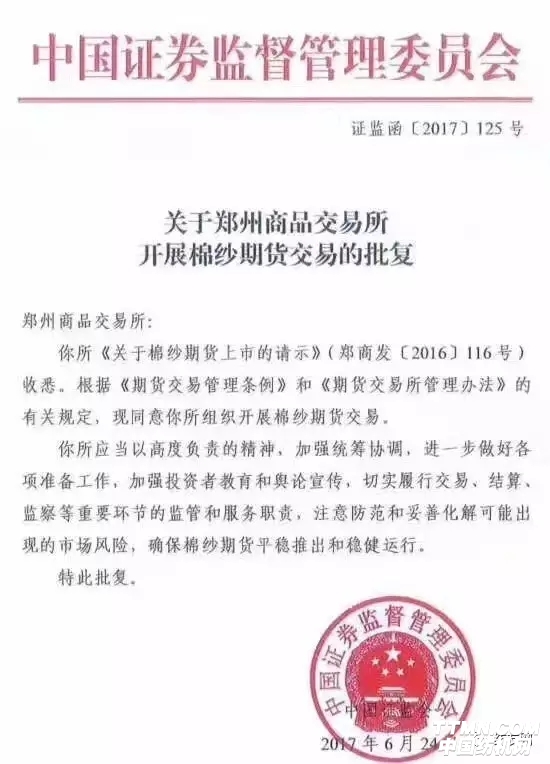 今年6月底,證監會批準鄭州商品交易所開展棉紗期貨交易!