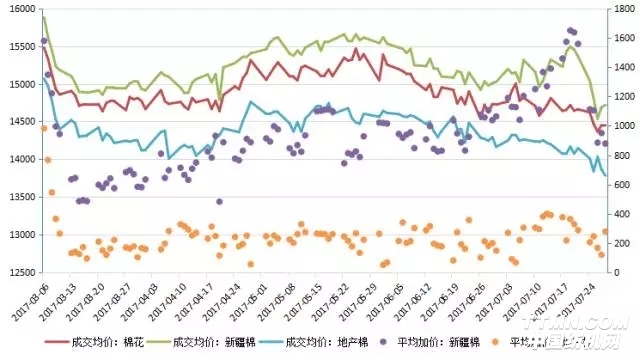 就在市場仍在爭論拋儲延期與否的同時,中儲棉關于儲備棉輪出第六批計劃通知悄然而出,計劃在市場新增投放41.4萬噸新疆棉。短短不到一周內,市場就已經給出了反應。鄭棉期貨價格一路下行,拋儲成交率、成交均價亦步亦趨、雙雙驟降。本周不管是新疆棉抑或地產棉,平均加價水平都由上周的高點大幅下跌,由此可見,市場對后期供應還是持較為樂觀態度。