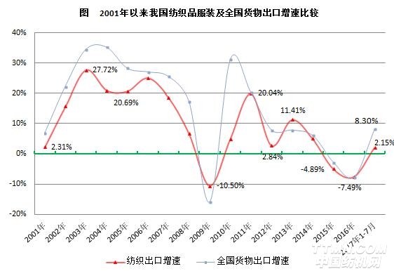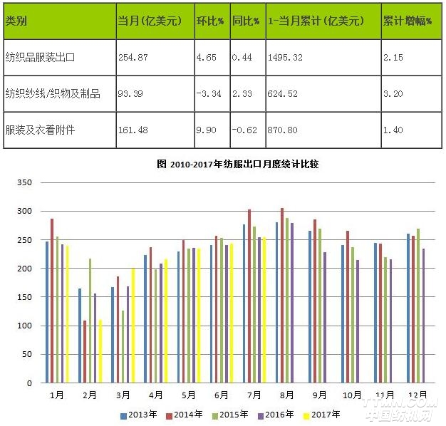根據(jù)海關(guān)總署數(shù)據(jù),2017年1-7月份我國紡織品服裝累計(jì)出口1495.32億美元,同比增長2.15%。其中,紡織品出口624.52億美元,同比增長3.20%,服裝及其附件出口870.80億美元,同比增長1.40%。連續(xù)5個(gè)月出口呈現(xiàn)穩(wěn)步回暖的積極態(tài)勢。全年紡織服裝出口一舉扭轉(zhuǎn)連續(xù)兩年萎縮頹勢已成定局。