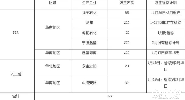 化纖產業鏈上游工廠春節期間裝置檢修計劃表
