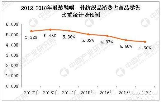 2017年我國商品消費總額為326618億元,同比增長10.2%。經統計整理,2017年服裝鞋帽、針紡織品消費占商品零售比重為4.46%。與2016年4.87%的比重相比有所下滑,照此發展,預計2018年服裝鞋帽、針紡織品在商品零售中占比會進一步降至4.3%。