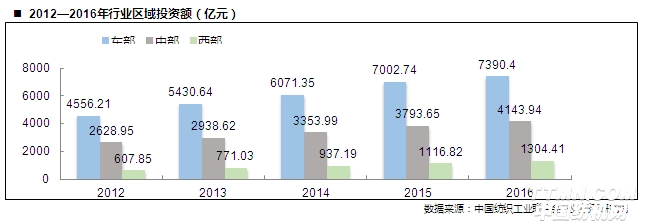 從投資來看,2012年~2016年,東部地區(qū)投資額由4556.21億元增長至7390.40億元,增長了62.20%;中部地區(qū)投資額由2628.95億元增長至4143.94億元,增長了57.63%;西部地區(qū)投資額由607.85億元增長至1304.41億元,增長了114.60%。但從總產(chǎn)值看,東部地區(qū)紡織產(chǎn)業(yè)、服裝產(chǎn)業(yè)、化纖產(chǎn)業(yè)的工業(yè)銷售總產(chǎn)值均占到全國的72%以上。2016年中紡聯(lián)確定的199家產(chǎn)業(yè)集群,主營業(yè)務(wù)收入約占全行業(yè)的40%。其中東部地區(qū)占到集群總數(shù)的84%,中部地區(qū)占到11%,西部地區(qū)只占5%。這種區(qū)域上的不平衡阻礙了資源的高效流動與應(yīng)用,限制了區(qū)域比較優(yōu)勢的發(fā)揮,制約了行業(yè)的可持續(xù)發(fā)展。