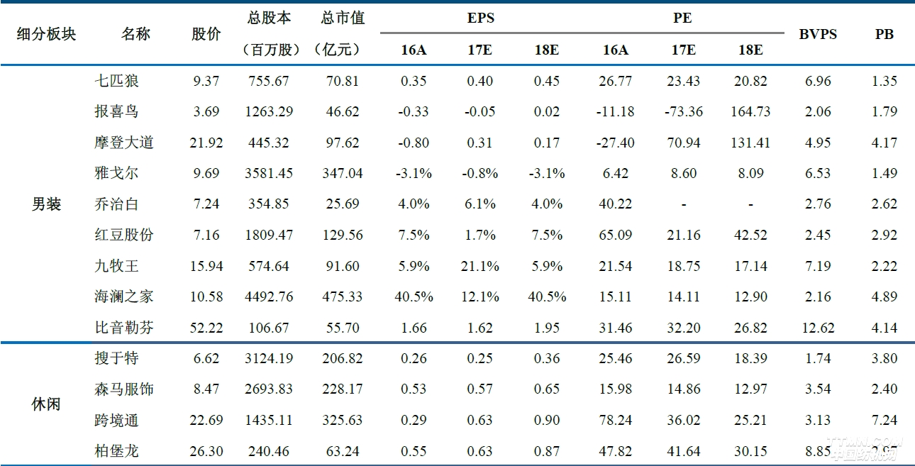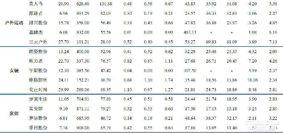 以下是紡織服裝行業重點公司估值表: