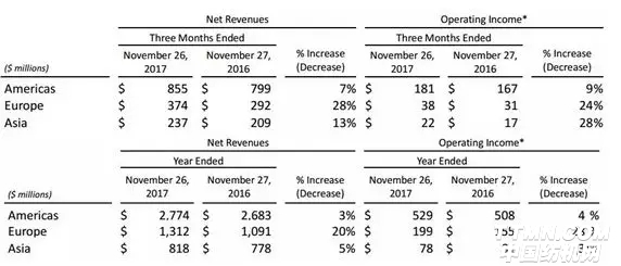 圖為Levi's母公司第四季度和2017財年各地區主要業績數據