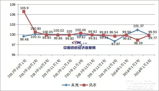 1月風衣內銷環比價格指數收于98.63點。其中,1月1旬環比價格指數收于99.82點,1月2旬收于98.39點,1月3旬收于99.77點。