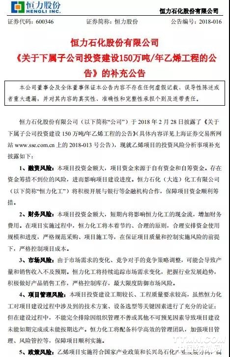 3月1日,恒力股份公告顯示,項目實施主要受融資、財務、市場、項目管理、政策等風險因素影響,可能直接影響項目的經濟效益。