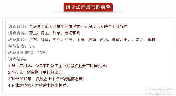★復工情況地處廣東地區的紡織服裝企業年后訂單充足,開工順利。大年初四,廣東溢達紡織有限公司下屬布廠、棉紡廠相繼投入節后生產運行。大年初六,制衣廠、輔料廠及財務、資訊科技部等公共部門也已開工。大年初七,廣州市格風服飾有限公司、深圳嘉汶服飾有限公司等服裝服飾企業全面開工。