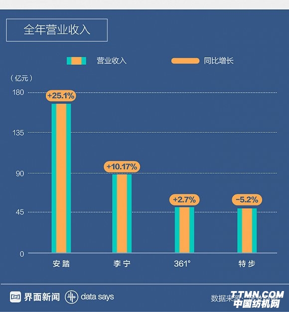 安踏、李寧、361°和特步的全年營收分別為166.92億元、88.74億元、51.58億元和51.13億元。受到戰略轉型和零售渠道變革的影響,特步是唯一出現營收下滑的品牌。